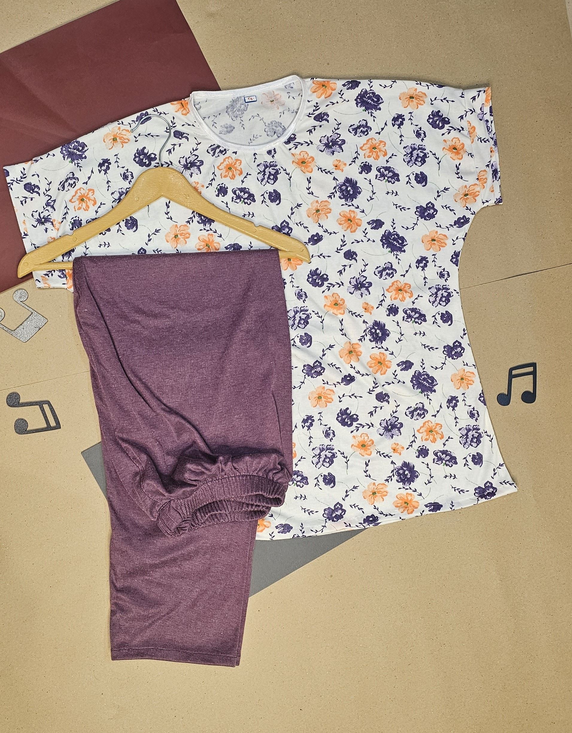 تیشرت زنانه نخی استین دار طرح گل پنبه یاسی