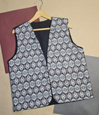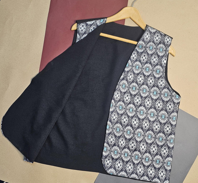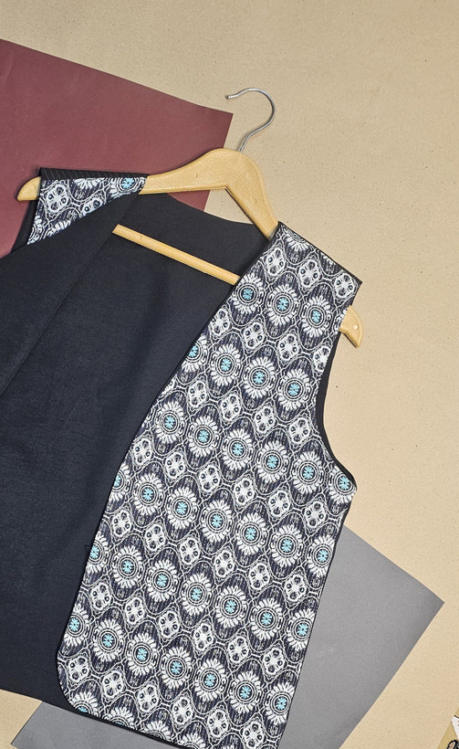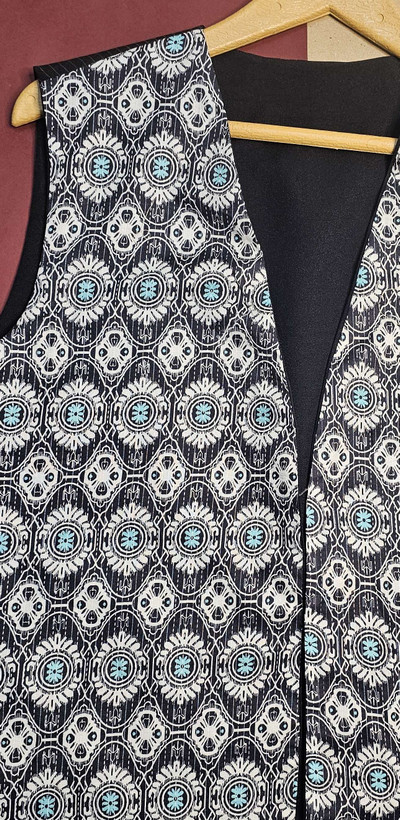 جلو رویه اصلی و جلیقه از پارچه کاتاباتیک کوک دوزی شده و پشت رویه اصلی از دیپلمات خطی رویه دیگر پارچه دیپلمات ساده یا خطی