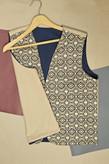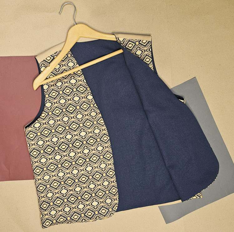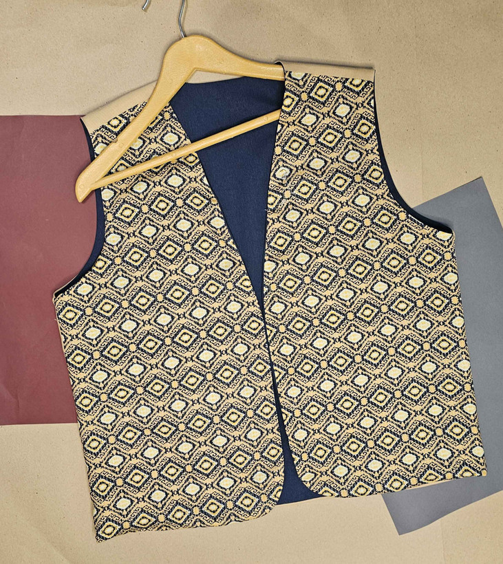 جلو رویه اصلی و جلیقه از پارچه کاتاباتیک کوک دوزی شده و پشت رویه اصلی از دیپلمات خطی رویه دیگر پارچه دیپلمات ساده یا خطی