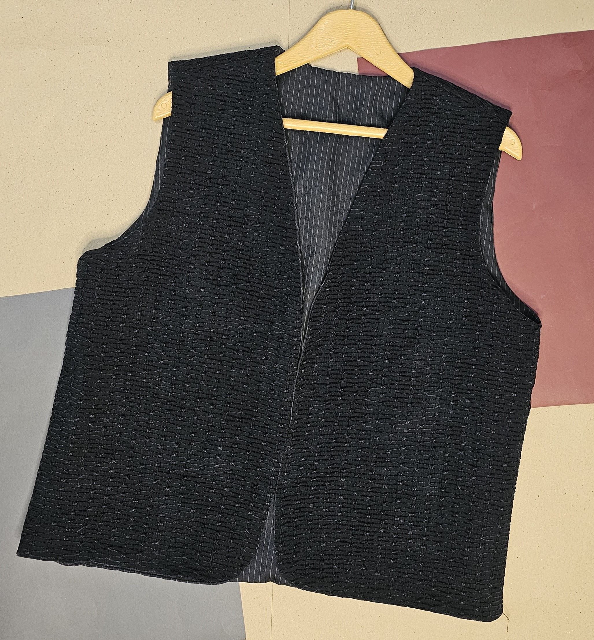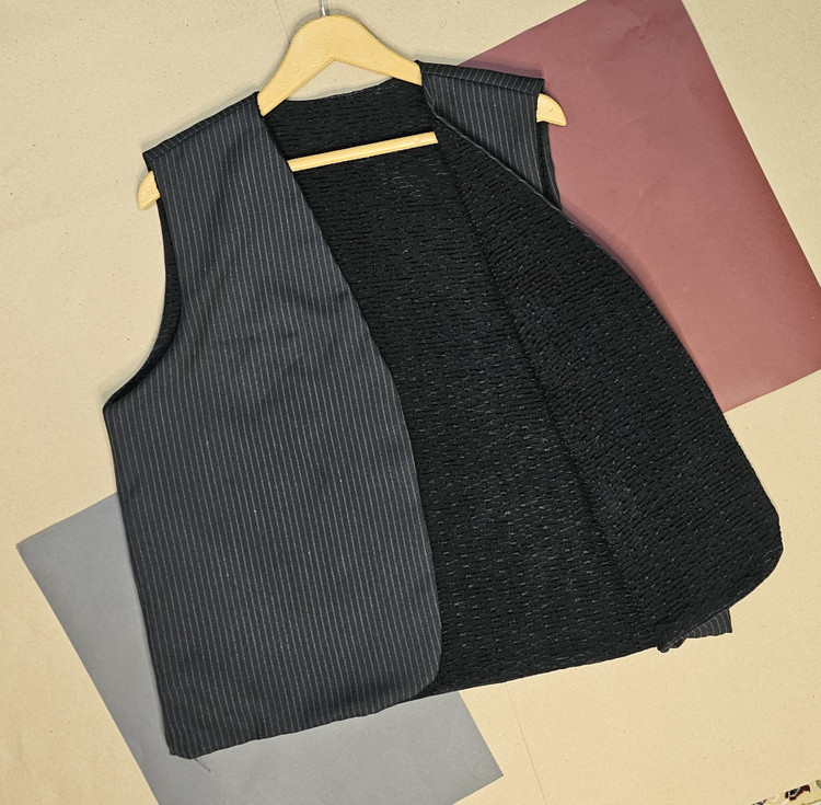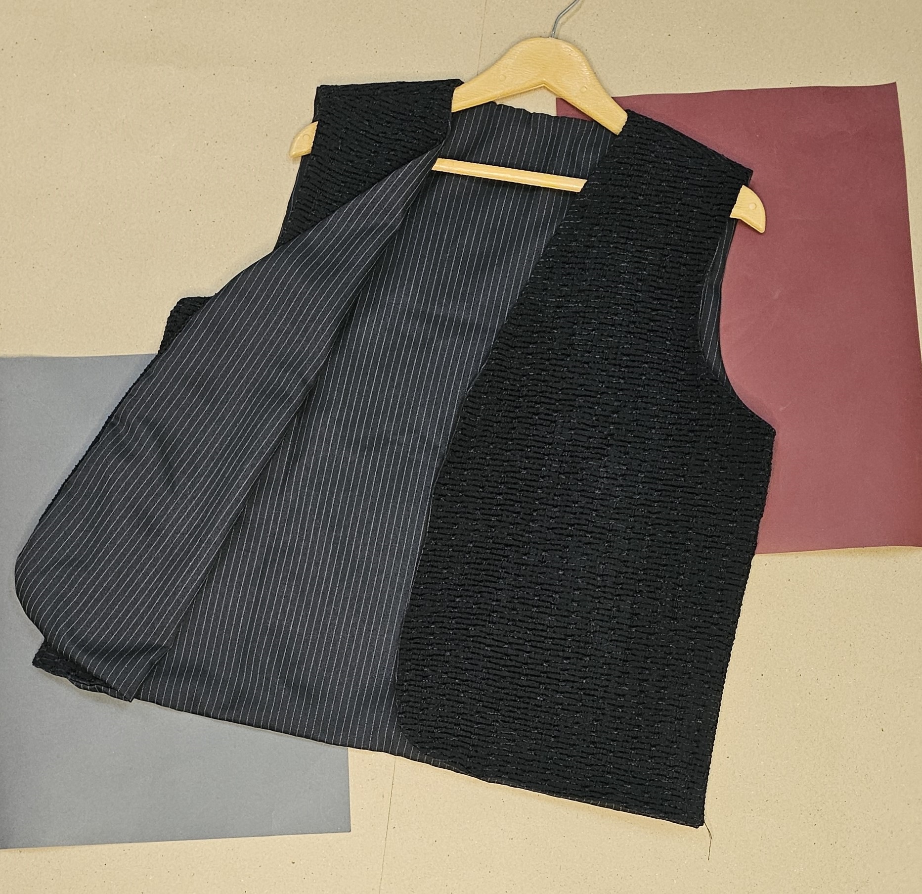 این جلیقه از دو لایه پارچه متفاوت دوخته شده لایه اصلی از پارچه ژاکارد پلیسه عنکبوتی و رویه دیگر پارچه دیپلمات خطی مرغوب