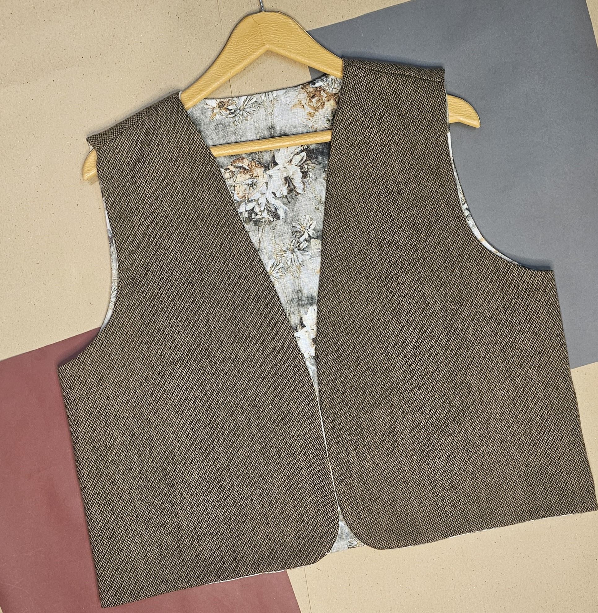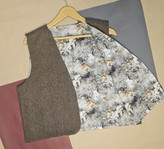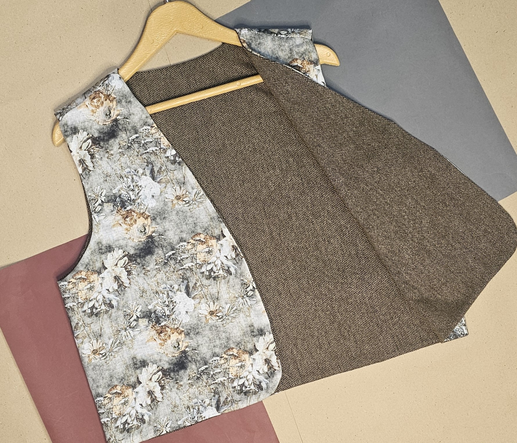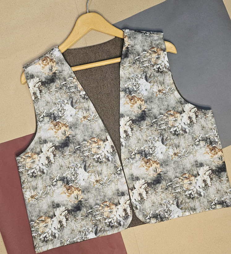 یک روی این جلیقه از پارچه شانتون نخی گلدار با لطافت بالا و ظاهر هنری دوخته شده و روی دیگر آن از پارچه فاستونی ساده با بافت ویژه است که جلوهای شیک و رسمیتر به استایل میدهد.