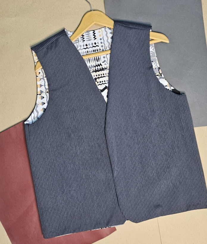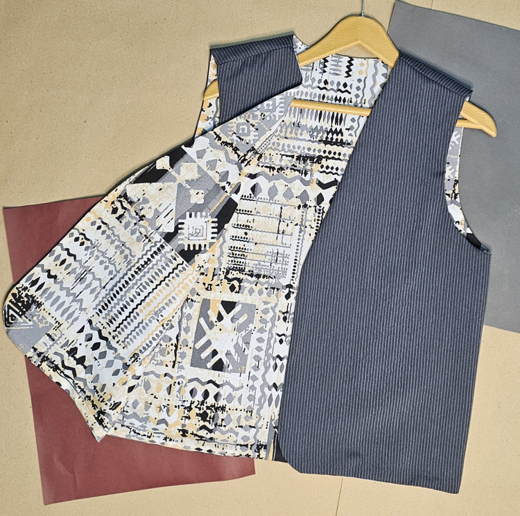 جلیقهی دوروی نقش مارلیک از تولیدات پرفام، روایتگر مسیرهاییست که سنت و مدرنیته را به هم پیوند میدهند. رویهی اصلی از کتان نخی با ترکیب نقوش هندسی الهامگرفته از بافتها و نشانههای بومی طراحی شده و رویهی دوم از پارچه دیپلمات خطی طوسی که ظاهری مینیمال، رسمیتر و شهری به لباس میبخشد.